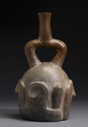 Keywords: ChavĂn - Feline-and-Cactus Stirrup Vessel - Walters 482832 - Back.jpg This Tembladera-style Chavín work depicts a feline rendered in relatively high relief alternating with a cactus form that may refer to the hallucinogenic San Pedro cactus Chavín is considered the mother civilization of the South-American Andes and is often compared to the Olmec of Mexico in that both cultures established many patterns of art architecture and culture by 1000 BC that prevailed until the arrival of Europeans in the 16th century Stirrup-spout vessels like this example were made by the Chavín and many other South-American peoples using a number of molds with details modeled by hand Although we do not know what was stored in these vessels suggestions include corn beer or chicha a native Andean fermented beverage Chavín stirrup-spout vessels vary in both their architecture spout-width shape direction and type of decoration Many combine incised design with modeled form as in this example Felines of the type depicted on this vessel were important in Chavín art and culture because they were associated with the ruling houses In nature such animals are often excellent hunters who occupy the top of the food chain qualities also valued in human rulers Felines like jaguars and pumas were also thought to enjoy great spiritual force; shamans were believed to transform into such creatures between 900 200 BC Early Horizon-Early Intermediate ceramic grayware cm 29 85 17 15 accession number 48 2832 79372 Mr Alexis Forrester London before the late 1970s mode of acquisition unknown Economos Works of Art Santa Fe New Mexico date and mode of acquisition unknown Private collection 1991 by purchase Walters Art Museum Anonymous gift 2009 place of origin Peru Walters Art Museum license Chavin art in the Walters Art Museum Sculptures of cats |