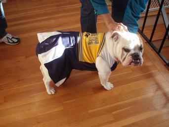 Keywords: Cheddar Cheerleader.JPG en my bulldog Cheddar dressed up in a georgia tech cheerleader outfit i It's so adorable Sized for a 6 yr old girl own Fraser dylan 11-28-09 English Bulldog Dogs wearing clothes
