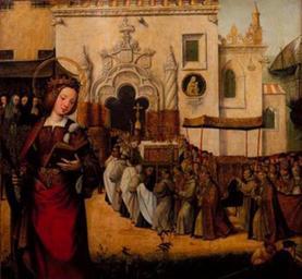 Keywords: Chegada das Relíquias de Santa Auta àIgreja da Madre de Deus.jpg pt Destaca-se neste painel a fachada manuelina da Madre de Deus com a cimalha de ameias chanfradas alternando com escudos de três palas gárgulas góticas e friso da cimalha com pequenas esferas em relevo O portal tem arco trilobado sendo o tímpano lavrado e encimado por molduras em voluta rematando dos lados em bolotas Completa o conjunto o escudo português de D João II ao centro ladeado pelo escudo com a divisa de D João II o pelicano e o escudo com o símbolo da rainha D Leonor o camaroeiro Os dois botaréus torsos que se dispõem lateralmente ao portal são encimados ao nível dos escudos por coroas reais de onde partem corohéos piramidais igualmente torsos Dois panos de brocado de ouro com ramagens grená cobrem os botaréus e os lados do portal até ao nível do arco Na fachada por baixo de uma pequena janela rectangular colocado sobre uma mísula assenta um medalhão della Robbia com cercadura de festões de folhagem castanha com frutos amarelos e centro com fundo de esmalte esverdeado e a escultura da Virgem com o Menino 2013-01-08 23 45 20 IGESPAR Creator Gregório Lopes PD-old-100 Uploaded with UploadWizard Gregório Lopes |