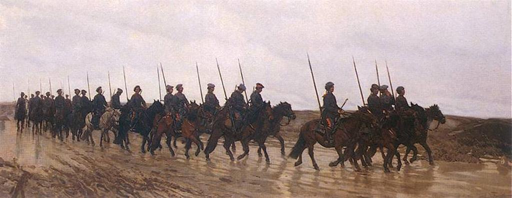 | Keywords: ChelmonskiJozef.1881.KozacyWMarszu.jpg  Artwork Creator Józef Chełmoński 1881 oil on canvas cm 70 175 Institution National Museum Warsaw object history exhibition history credit line accession number PD-old-auto 1914 1881 paintings Chełmoński Józef Russian Cossacks in art Paintings of Cossack men on horseback Military paintings by Józef Chełmoński Lancers |