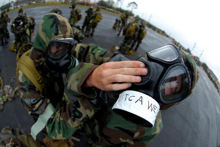 Keywords: Chemical, Biological and Radiological Warfare Drill DVIDS124753.jpg en Apprentice Robert Weiss utilitiesman constructionman assigned to Naval Mobile Construction Battalion 1 holds his MCU-2P gas mask in place while a fellow Seabee tightens his overhood during a chemical biological and radiological warfare drill at Naval Construction Battalion Center Gulfport 2008-10-24 Petty Officer 1st Class Demetrius Kennon https //www dvidshub net/image/124753 081024-N-+++++-006 2008-10-27 20 13 GULFPORT MS US PD-USGov-Military-Navy M40 Field Protective Mask Images from DoD uploaded by Fæ |