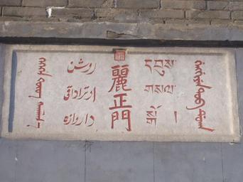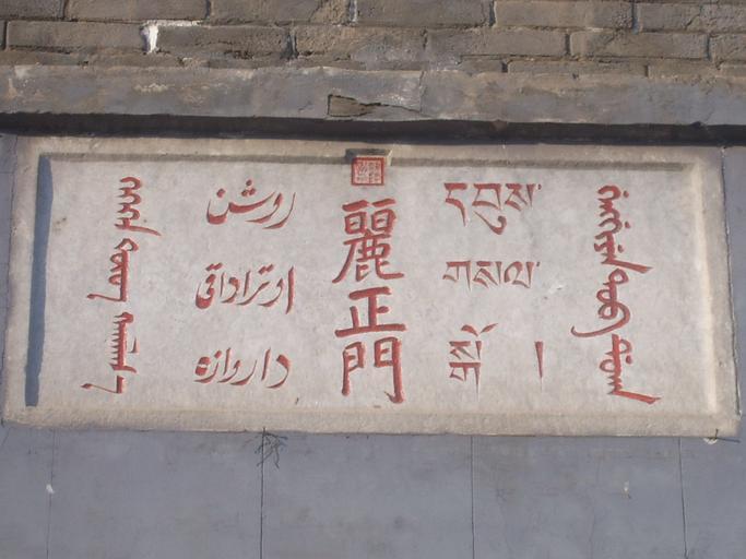 Keywords: Chengde summer palace writings.jpg Qing dynasty languages on a sign at the summer palace in fr Résidence de montagne de Chengde; from left to right Mongolian Uighur Chinese Tibetan Manchu 丽正门 / 麗正 / Lì zhèng mén / Gate of Beauty and Rightousness / Porte de la Beauté et de la Justice or sometimes 大南门 / 大南 / Dà nán mén / Greater south gate / Grande porte du Sud - location http //wikimapia org/55817/cn/ E5 A4 A7 E5 8D 97 E9 96 80- E9 BA 97 E6 AD A3 E9 96 80-Greater-south-gate Personal picture October 06 User Vberger Qing Dynasty Files by User Vberger Manchu script Uyghur Arabic script Chinese characters Tibetan writing Multilingual signs in China Signs in Mongolian script |