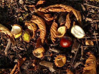 Keywords: chestnut buckeye fruit concerns ground collect autumn fruits brown shine toxic forest floor earth grass moss leaves shell prickly pieksig sleeve