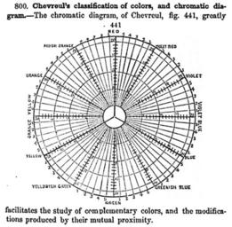 | Keywords: Chevreul's RYB chromatic diagram.png en Chevreul's 1855 chromatic diagram based on Red “Yellow “Blue color model for paint mixture as reprinted by Benjamin Silliman 1859 First principles of physics or Natural philosophy designed for the use of schools and colleges http //books google com/books id Mj5JAAAAIAAJ pg RA2-PA491 dq diameter+red+yellow+blue+orange+green+violet lr as_drrb_is b as_minm_is 0 as_miny_is as_maxm_is 0 as_maxy_is 1860 num 20 as_brr 0 ei Gd8SS9GeH4KmkASC8rXeCw v onepage q diameter 20red 20yellow 20blue 20orange 20green 20violet f false p 490 of Benjamin Silliman 1859 First principles of physics or Natural philosophy designed for the use of schools and colleges Benjamin Stillman after Chevreul 1859 book reprinting 1855 diagram PD-old 19th-century diagrams Psychophysics Michel Eugène Chevreul Colorwheels Chromatic diagrams English text |