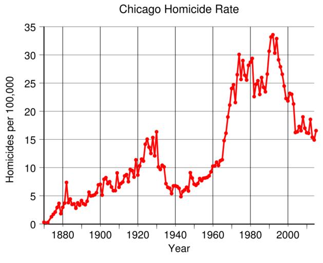 Keywords: Chicago Homicide Rate.svg en Chicago homicide rate per 100 000 population from 1870 to 2015 Data source 1870 to 1930 https //homicide northwestern edu/database/ and 1931 and 1933 to 1959 FBI UCR reports https //www icpsr umich edu/icpsrweb/ICPSR/studies/3666 1960 to 2014 from Chicago Police reports http //www chicagocop com/resources/documents_archive/annual_reports/cpd_annual_reports/Chicago 20Police 20Department 20Annual 20Report 20- 201952 pdfhttps //portal chicagopolice org/portal/page/portal/ClearPath/News/Statistical 20Reports/Murder 20Reports/2001 20Murder 20Reports/Homicide2001 pdfhttps //portal chicagopolice org/portal/page/portal/ClearPath/News/Crime 20Statistics/Crime 20Statistics 20Year 20End 1932 from Annual Report of the Citizens' Association of Chicago December 1935 pg 12 1933 fromhttp //archive org/stream/chicagosreportto00chic/chicagosreportto00chic_djvu txt Population from US Census 2015-03-10 own Delphi234 other versions thumb left Number of homicides Generated with Wikimedia SVG Chart SVG Chart/box cc-zero Homicide rates |