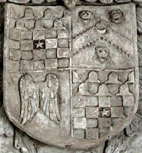 Keywords: ChichesterEscutcheon 1608 RuxfordBarton Crediton Devon Detail.PNG en detail of 1608 strapwork plaster escutcheon of four quarters in upstairs bedroom of Ruxford Barton near Crediton Devon England Armorials 1 4 Chequy or and gules a chief vair a mullet for difference Chichester ; 2 Argent a chevron engrailed gules between three lion's faces azure a crescent for difference Copleston of Eggesford ; 3 Gules a pair of wings conjoined ermine de Reigny of Eggesford With initials EC and AC for Edward Chichester 1st Viscount Chichester 1568-1648 and his wife Anne Copleston 1588 “1616 sole daughter and heiress of John Copleston died 1606 of Eggesford own photo Lobsterthermidor <span class signature-talk ></span> 18 10 11 June 2015 UTC photo 2015 Ruxford Sandford Chichester arms Reigny arms Copleston arms |