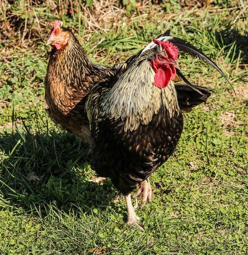 Keywords: chickens rooster cock birds hen farms grasses green lands two birds domestic fowls poultry farming