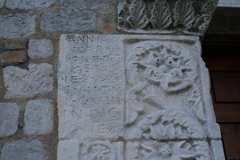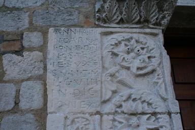 Keywords: Chiesa di San Clemente al Vomano (TE) - portale 03.jpg it Particolare della pietra recante l'iscrizione Anni ab incarnazione Domini nostri Iesu Christi sunt Mille C VIII Indictione XV sul portale della chiesa di San Clemente al Vomano facciata principale dell'edificio religioso appartenente al complesso abbaziale omonimo nel paese di Guardia Vomano in provincia di Teramo Abruzzo Italia esterno giorno Own Infinitispazi 2009-02-26 San Clemente al Vomano Guardia Vomano Notaresco - Portal Reliefs in Notaresco |