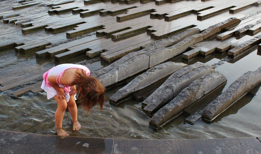 Keywords: child girl human water wet fountain naked feet splashing fountain city play children playing children fun stones rock formations