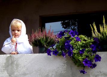 Keywords: child girl tradition peasant woman flowers balcony innocence coloring