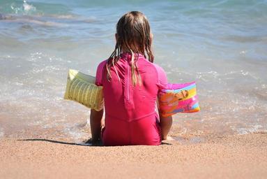 Keywords: child sea girl beach people uv-resistant clothing pink rubber rings