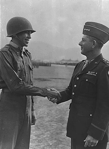 Keywords: Childers and Devers handshake.jpg en Lt Ernest Childers a Creek being congratulated by Gen Jacob L Devers after receiving the Congressional Medal of Honor in Italy for wiping out two machine gun nests 535783 Unknown employee of the Office of War Information 1944-04-12 PD-USGov Ernest Childers Jacob L Devers Handshakes involving the military |