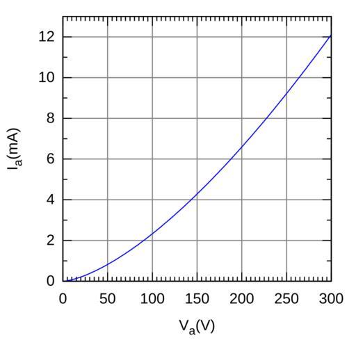 Keywords: ChildLangmuirLawGraph1.svg python <syntaxhighlight lang python > from matplotlib pyplot import from math import sqrt from numpy import linspace fig figure figsize 4 4 ax1 fig add_subplot 111 ax1 grid True A 1e-4 cathode are 1 cm 2 d 1e-2 cathode-anode distance 1cm Va linspace 0 300 100 e 1 6e-19 electronic charge m 9 11e-31 electronic mass e0 8 85e-12 permitivitty of free space def childLaw V return 4 e0 sqrt 4 e/m A V 1 5/ d 2 9 Ia childLaw Va ax1 plot Va Ia ax1 grid True ax1 set_xlabel r V_a ax1 set_ylabel r I_a fig show fig savefig ChildLangmuirLawGraph1 svg bbox_inches tight \ pad_inches 15 </syntaxhighlight> sr П иказан је г аф Чајлд-Лангмуи овог закона то јест овисност анодне ст ује о анодном напону за идеализи ану вакуумску диоду Пов шина катоде А 1 cm2 удаљеност катода-анода d 1 cm Ко иштена фо мула је из чланка Те моелект онска емисија на с пској википедији own Krishnavedala 2011-06-04 File ChildLangmuirLawGraph1 png validSVG Cc-zero Vacuum tube diagrams Images with Python source code Created with Matplotlib Device current-voltage characteristics |