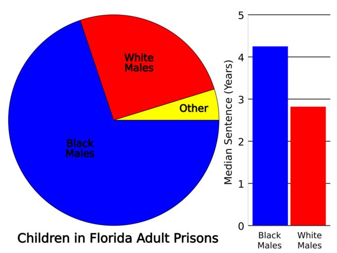Keywords: Children in Florida Adult Prisons.svg translate yes en In February 2015 there are 126 children in Florida adult prisons They are predominantly black males 70 The sentences they are serving have a median length that is 50 longer than those of the 25 who are white males 4 25 years for black males 2 82 years for white males Data from Florida Department of Corrections http //www dc state fl us/ 2015-02-22 own Delphi234 other versions cc-zero Uploaded with UploadWizard Correctional population statistics for the United States Demographics of Florida |