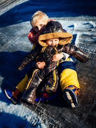 Keywords: children playing winter snow slide happy fun young cute childhood friends kid smiling joy together outdoors little