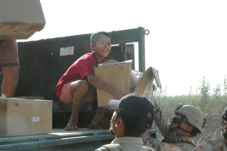 Keywords: Children rush to help Soldiers unload boxes packed with school supplies DVIDS10072.jpg en Children from the Baghdad Airport Primary School in Baghdad rushed to help Soldiers from Alpha and Headquarters and Headquarters Companies 2nd Battalion 299th Infantry Regiment Hawaii Army National Guard; and Alpha Company 3rd Bn 297th Inf Rgt Alaska ANG unload boxes packed with Operation Iraqi Children school supply kits Sept 11 Each of the 300 first through seventh grade children received a personal care package that included pens pencils paper and crayons as well as got a chance to talk with the Soldiers and try on their gear 2005-09-11 https //www dvidshub net/image/10072 10072 2005-09-21 16 22 BAGHDAD IQ PD-USGov Hawaii Army National Guard Images from DoD uploaded by Fæ |