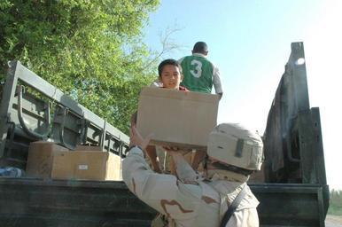 Keywords: Children rush to help Soldiers unload boxes packed with school supplies DVIDS10071.jpg en Children from the Baghdad Airport Primary School in Baghdad rushed to help Soldiers from Alpha and Headquarters and Headquarters Companies 2nd Battalion 299th Infantry Regiment Hawaii Army National Guard; and Alpha Company 3rd Bn 297th Inf Rgt Alaska ANG unload boxes packed with Operation Iraqi Children school supply kits Sept 11 Each of the 300 first through seventh grade children received a personal care package that included pens pencils paper and crayons as well as got a chance to talk with the Soldiers and try on their gear 2005-09-11 https //www dvidshub net/image/10071 10071 2005-09-21 16 22 BAGHDAD IQ PD-USGov Hawaii Army National Guard Images from DoD uploaded by Fæ |