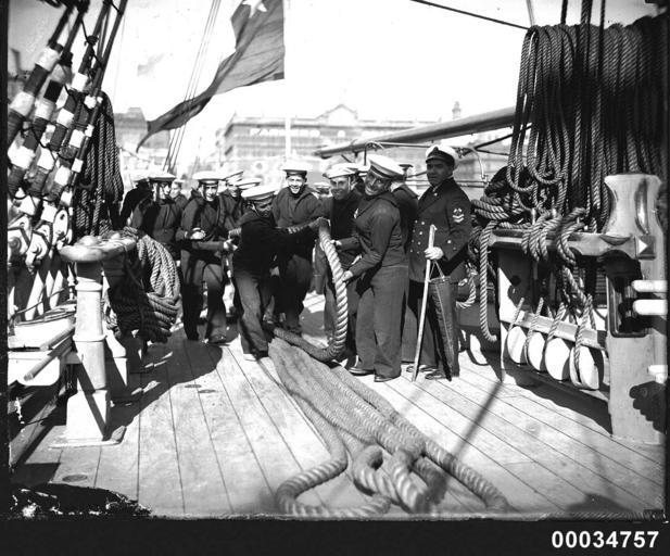 | Keywords: samuel j hood collection samueljhoodcollection baquedano corvette sydney harbour sydneyharbour harbour scenes harbourscenes circular quay circularquay people chilean “naval vessel” sailor sailors blackandwhite monochrome black and white The GENERAL BAQUEDANO moored at East Circular Quay on 16 July 1931 and the crew spent two weeks in Sydney. The ship had previously visited Sydney in 1903. In 1931, the vessel was considered obsolete as a fighting ship, but very useful as a training vessel. In naval categories, GENERAL BAQUEDANO is known as a corvette (in Spanish corbeta), which is defined as a flush-decked ship with one tier of guns, a type replaced by the modern cruiser. Fully-rigged, the vessel was fitted with triple-expansion engines as auxiliary, and had a displacement of 2,330 tons. The visit attracted significant public interest and the daily activities of the Chileans were reported in the Sydney Morning Herald. The crew played a soccer match against members of the HMAS CANBERRA crew, laid a wreath at the Martin Place cenotaph, displayed their rigging skills while aloft and opened their vessel to the public. Captain Alvarez also hosted visits by the Governor of NSW Sir Phillip Game, the Premier of NSW and the Lord Mayor. The departure of GENERAL BAQUEDANO from Sydney Harbour was quite eventful, with one rating attempting to desert the ship and swim ashore, two sailors being left at the dock and transported to the vessel by police launch and another bewildered Chilean was found wandering the streets. He was later reunited with his fellow sailors in Auckland after transport was arranged on a departing cargo ship. This photo is part of the Australian National Maritime Museum’s Samuel J. Hood Studio collection. Sam Hood (1872-1953) was a Sydney photographer with a passion for ships. His 60-year career spanned the romantic age of sail and two world wars. The photos in the collection were taken mainly in Sydney and Newcastle during the first half of the 20th century. The ANMM undertakes research and accepts public comments that enhance the information we hold about images in our collection. This record has been updated accordingly. Photographer: Samuel J. Hood Studio Collection Object no. 00034757 The GENERAL BAQUEDANO moored at East Circular Quay on 16 July 1931 and the crew spent two weeks in Sydney. The ship had previously visited Sydney in 1903. In 1931, the vessel was considered obsolete as a fighting ship, but very useful as a training vessel. In naval categories, GENERAL BAQUEDANO is known as a corvette (in Spanish corbeta), which is defined as a flush-decked ship with one tier of guns, a type replaced by the modern cruiser. Fully-rigged, the vessel was fitted with triple-expansion engines as auxiliary, and had a displacement of 2,330 tons. The visit attracted significant public interest and the daily activities of the Chileans were reported in the Sydney Morning Herald. The crew played a soccer match against members of the HMAS CANBERRA crew, laid a wreath at the Martin Place cenotaph, displayed their rigging skills while aloft and opened their vessel to the public. Captain Alvarez also hosted visits by the Governor of NSW Sir Phillip Game, the Premier of NSW and the Lord Mayor. The departure of GENERAL BAQUEDANO from Sydney Harbour was quite eventful, with one rating attempting to desert the ship and swim ashore, two sailors being left at the dock and transported to the vessel by police launch and another bewildered Chilean was found wandering the streets. He was later reunited with his fellow sailors in Auckland after transport was arranged on a departing cargo ship. This photo is part of the Australian National Maritime Museum’s Samuel J. Hood Studio collection. Sam Hood (1872-1953) was a Sydney photographer with a passion for ships. His 60-year career spanned the romantic age of sail and two world wars. The photos in the collection were taken mainly in Sydney and Newcastle during the first half of the 20th century. The ANMM undertakes research and accepts public comments that enhance the information we hold about images in our collection. This record has been updated accordingly. Photographer: Samuel J. Hood Studio Collection Object no. 00034757 |