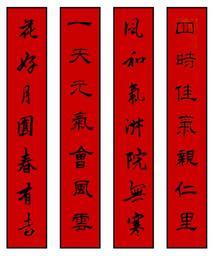 Keywords: Chinese calligraphy x4.png 2005-12-24 own assumed Nécropotame~commonswiki Par Nécropotame<br/> Source Image Wall's chinese calligraphy jpg Atelier graphique Meaning First I think they should be read by 1 3 and 2 4 1-四時佳氣親仁里 四時:four times morning evening day night 佳氣:good sense 親::to be close 仁里:friendly neighbor 3- 天元氣 風雲 天:one day 元氣:vigor :will be 風雲:winds and clouds very high 2-風和氣淑院無寒 風和:winds are peace 氣淑:airs are perfect 院:the yard 無寒:not cold 4-花好 春 吉 花好:flowers are good :the moon is circular full moon 春:the spring 吉:have auspicious things Sens Sentence 1 Bon ambience ou bon air / temps de quatre saisons et voisins amicables Sentence 3 En temps atomospherique d'un jour il y peut avoir vents et nuage Ce n'est pas un bonne couplets je pense Sentence 4 Fleurs sont bons la lune est ronde printemps avec bonne chance Sentence 2 Vent est gentil l'air est clair cour du maison sans froid C'est très excellemment arrangé sept mot et sept correspondences --polyhedron 古韻 留 19 54 2005年12 24日 UTC Chinese calligraphy Couplet Chinese poetry