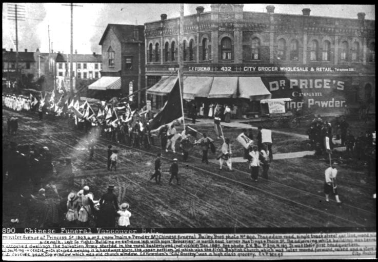 Keywords: blackandwhite monochrome black and white DESCRIPTION: Chinese funeral procession on Westminster at Princess (now Main and Pender). The City Grocery Company at 450 Westminster is visible in the background. VPL Accession Number: 17064 Date: 1894 Photographer/Studio: Unknown SUBJECTS: Chinese - Funeral customs and rites, Funeral rites and ceremonies, Chinese Canadians Location: British Columbia - Vancouver - Main Street British Columbia - Vancouver - Pender Street More information on our historical photograph collection: www.vpl.ca/historicalphotos DESCRIPTION: Chinese funeral procession on Westminster at Princess (now Main and Pender). The City Grocery Company at 450 Westminster is visible in the background. VPL Accession Number: 17064 Date: 1894 Photographer/Studio: Unknown SUBJECTS: Chinese - Funeral customs and rites, Funeral rites and ceremonies, Chinese Canadians Location: British Columbia - Vancouver - Main Street British Columbia - Vancouver - Pender Street More information on our historical photograph collection: www.vpl.ca/historicalphotos |