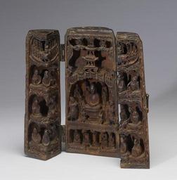 Keywords: Chinese - Portable Buddhist Shrine - Walters 61266 - Three Quarter.jpg This is a portable shrine of the type that played a role in the transmission of Buddhism from Central Asia to China and from China to Korea and Japan Carved out of a single piece of wood somewhere in China it may have been subsequently carried to Japan Most of the figures can be identified but it is not customary to show them all together The historical Buddha Sakyamuni is shown preaching the Lotus Sutra one of the Mahayana Buddhist texts He is flanked by his chief disciples and by donors Above Buddha from the distant past appears and below an orchestra plays On wings at the top are a pair of Bodhisattvas Manjusri and Samantabhadra Below them are the sixteen disciples of Sakyamuni called arhats the Sanskrit word for a highly realized Buddhist ascetic or lohan in Chinese century 10 12 carved wood Open cm 19 05 20 64 8 26 accession number 61 266 33837 Yamanaka Co New York date and mode of aquisition unknown Henry Walters Baltimore 1920 Walters Art Museum Henry Walters Acquired by Henry Walters 1920 Sticker Y B 1980 Yamanaka Co Pilgrimage and Buddhist Art Asia Society New York 2010 place of origin China Walters Art Museum license Portable Buddhist Shrine - Walters 61266