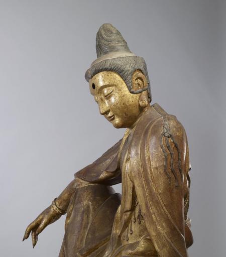 Keywords: Chinese - Seated Guanyin (Kuan-yin) Bodhisattva - Walters 25256 - Detail E.jpg This late Ming dynasty dry-lacquer sculpture is an image of the bodhisattva Guanyin an enlightened being venerated in Chinese Buddhism as an embodiment of compassion Called a Water-moon Guanyin or Guanyin sitting in Royal Ease this theme and its iconography derive from textual inspiration found in the Avatamsaka Sutra the central text of the Hua-yen school of Buddhism and indigenous Chinese traditions The dry lacquer technique was popular but examples of this size and degree of refinement are rare late 14th-15th century dry lacquer gold and paint cm 137 2 78 7 58 4 accession number 25 256 4483 C T Loo Co Paris Doris Duke October 7 1937 by purchase Doris Duke Charitable Foundation Walters Art Museum Gift of the Doris Duke Charitable Foundation's Southeast Asian Art Collection 2006 place of origin China Walters Art Museum license Seated Guanyin - Walters 25256