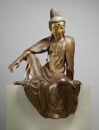 Keywords: Chinese - Seated Guanyin (Kuan-yin) Bodhisattva - Walters 25256.jpg This late Ming dynasty dry-lacquer sculpture is an image of the bodhisattva Guanyin an enlightened being venerated in Chinese Buddhism as an embodiment of compassion Called a Water-moon Guanyin or Guanyin sitting in Royal Ease this theme and its iconography derive from textual inspiration found in the Avatamsaka Sutra the central text of the Hua-yen school of Buddhism and indigenous Chinese traditions The dry lacquer technique was popular but examples of this size and degree of refinement are rare late 14th-15th century dry lacquer gold and paint cm 137 2 78 7 58 4 accession number 25 256 4483 C T Loo Co Paris Doris Duke October 7 1937 by purchase Doris Duke Charitable Foundation Walters Art Museum Gift of the Doris Duke Charitable Foundation's Southeast Asian Art Collection 2006 place of origin China Walters Art Museum license Seated Guanyin - Walters 25256