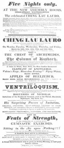 | Keywords: Ching Lau Lauro 10-14 Mar 1834.jpg New Assembly Rooms Queen Street Wolverhampton playbill of Monday-Friday 10-14 March 1834 advertising the magician Ching Lau Lauro and mentioning his performance of the Suspension Illusion for the first time The playbill says that he has performed before Their Majesties at the Pavilion Brighton and received a letter of commendation http //www gutenberg org/files/42723/42723-h/images/illpg_231_lg jpg<br/>This image also appears in Houdini Harry 1908 The Unmasking of Robert-Houdin New York Publishers Printing Co pp 230 “232 1834 Anon PD-old-70-1923 Ching Lau Lauro Playbills of the United Kingdom Aerial suspension illusion |