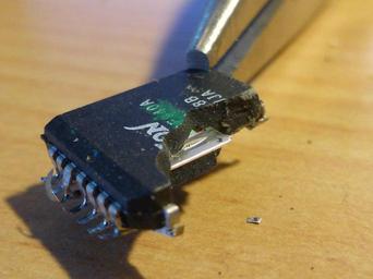 Keywords: Chip-broken-up-1.jpg de Aufgebrochener Microchip en Broken-up microchip 2016-02-19 14 49 07 own MartinThoma other versions cc-zero Images by Martin Thoma/Hardware Taken with Panasonic Lumix DMC-TZ41 Microchips