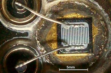 Keywords: Chipbond bipolartr.jpg en die and wire bonds on an older model of bipolar power transistor de Chip- und Drahtbondverbindungen eines älteren Bipolar-Leistungstransistors der quadratische Chip ist mit einem Goldlot auf eine runde Trägerplatte gelötet die ihrerseits an das Metallgehäuse gelötet ist Diese Verbindung leitet die Wärme ab und bildet den Kollektoranschluss Die beiden aus Aluminiumdraht gefertigten Drahtbondungen sind der Emitter- unten und der Basisanschluss oben die beide auf Beine in Glasdurchführungen links führen own Ulfbastel 2009-06-06 PD Power transistors |