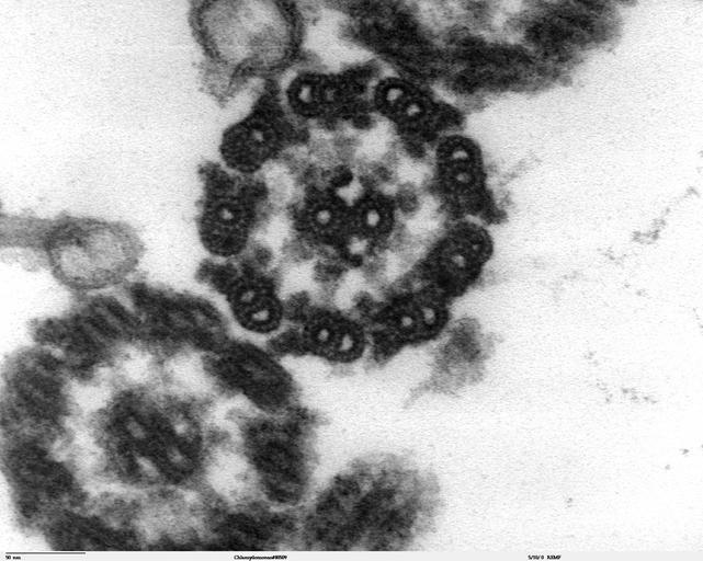 Keywords: Chlamydomonas TEM 13.jpg Transmission electron microscope image showing an example of green algae Chlorophyta <br><br>Chlamydomanas reinhardtii is a unicellular flagellate used as a model system in molecular genetics work and flagellar motility studies <br><br>This image is a thin x-section cut through the isolated axoneme Chlamydomonas flagella have the 9+2 structure characteristic of all eukaryotic cells The axoneme has a central unit containing two single microtubules and nine peripheral doublet microtubules known as the 9+2 Dynein sidearms project from the A tubule of each doublet Also visible in this image are the radial spokes and the inner sheath Source and public domain notice at http //remf dartmouth edu/imagesindex html 2007-09-20 Dartmouth Electron Microscope Facility Dartmouth College Released into the public domain Dartmouth Electron Microscope Facility Dartmouth College Chlamydomonas reinhardtii Transmission electron microscopic images Flagella |