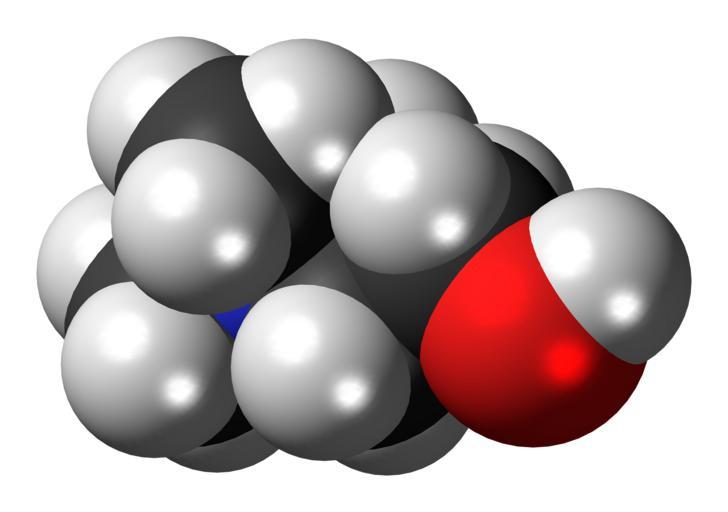 Keywords: Choline-cation-3D-spacefill.png Space-filling model of the choline cation a water-soluble essential nutrient The nitrogen atom has a positive charge Colour code 505050 Carbon C black<br> F0F0F0 Hydrogen H white<br> F51E1E Oxygen O red<br> 3C50FA Nitrogen N blue<br> 2011-02-03 own DS Visualizer Jynto talk Ball-and-stick version cc-zero Choline Images by Jynto Space-filling models |
