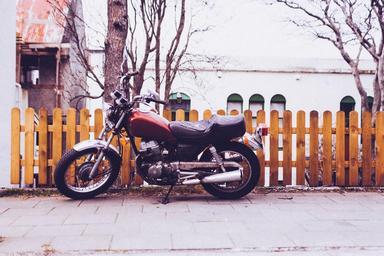 Keywords: chopper motorbike motorcycle bike moto vehicle parked fence urban