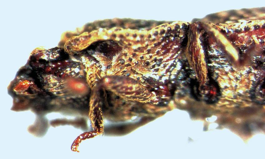 Keywords: Chorasus2.jpg en adult Chorasus sp showing antennal groove and cavity on prothoracic hypomeron self-photographed S E Thorpe 2010-06-24 NEW ZEALAND WO near Cambridge<br /> NZ 37 79˚S 175 55˚E TMRes<br /> F -; P - 402 78ha W846-112<br /> 33 cm diam litter 72hr Berlese<br /> Edge dist 5 1m -6 1m offset <br /> RK Didham 14-Feb-08 Unidentified Zopheridae Coleoptera head and pronotum |