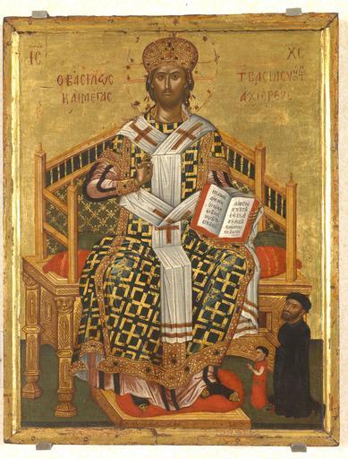 Keywords: Christ Great Hierophant (Candia, 16th c.).jpg Ο Χριστός έγας Αρχιερεύς και αφιερωτές τέλη 16ου αιώνα 44x56εκ άγνωστος ζωγράφος του Χάνδακα Στο ευαγγέλιο ου κρατεί ο Χριστός αναγράφονται ευαγγελικά χωρία α ό τον Ιωάννη 18 36 και τον ατθαίο 26 26 Στο χρυσό βάθος της εικόνας υ άρχουν οι ε ιγραφές Ι ησού C X ριστό C Ο ΒΑCΙΛΕΥC ΤΩ ΒΑCΙΛΕΥΟ ΤΩ ΚΑΙ ΕΓΑC ΑΡΧΙΕΡΕΥC Ο Χριστός καθισμένος σε λατύ θρόνο φοράει ατριαρχικό σάκκο και ωμοφόριο ό ως οι αρχιερείς καθώς και αυτοκρατορικό στέμμα με ρε ενδούλια και λώρο ό ως ο αυτοκράτορας Δεξιά α ό το υ ο όδιο στο ο οίο ατεί τα όδια του ο Χριστός εικονίζεται γονατισμένος γενειοφόρος αφιερωτής με μαύρο βενετικό ένδυμα και κάλυμμα στο κεφάλι και μ ροστά του μικρό αγόρι ε ίσης γονατισμένο με κόκκινα ενδύματα Και οι δύο ενώνουν τα χέρια μ ροστά στο στήθος σε δέηση http //eib xanthi ilsp gr/gr/icons asp late 16th century unknown painter of Candia PD-old Files uploaded by Shakko from various sources Christ Great Hierophant 16th-century icons of Greece Donor portraits with Jesus Christ Ktitor |