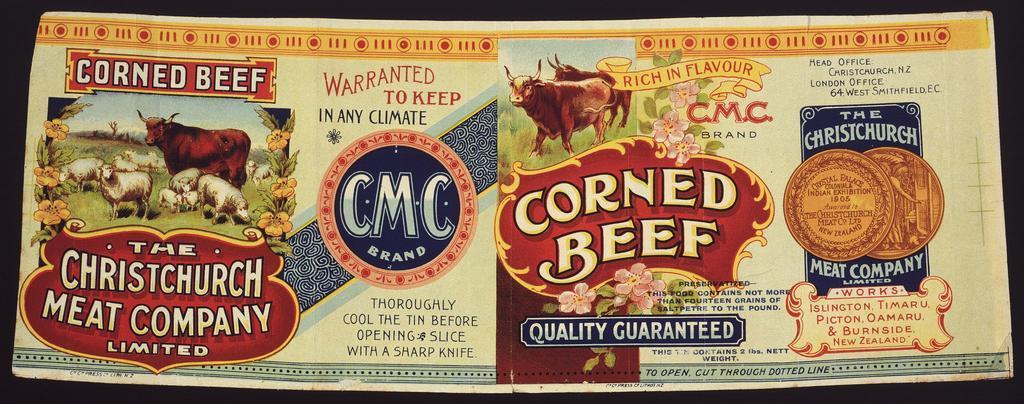 Keywords: Shows cattle and sheep in a field in one inset panel on the left, and a picture of two bulls at the top centre. Medals show the award won by the company at the Crystal Palace Colonial & Indian Exhibition in 1905. Decorative lettering and panels are used. Quantity: 1 colour art print(s). Physical Description: Chromolithograph, on label, 127 x 337 mm. Provenance: Donated loose in the back of the Gear Meat Company scrapbook. Christchurch Press Company Ltd. Christchurch Meat Company Limited :Corned beef, quality guaranteed. Ch[rist]ch[urch] Press Co Litho's, N.Z. [1906-1920?]. Ref: Eph-C-MEAT-1900s-04. Alexander Turnbull Library, Wellington, New Zealand. natlib.govt.nz/records/23048278 Shows cattle and sheep in a field in one inset panel on the left, and a picture of two bulls at the top centre. Medals show the award won by the company at the Crystal Palace Colonial & Indian Exhibition in 1905. Decorative lettering and panels are used. Quantity: 1 colour art print(s). Physical Description: Chromolithograph, on label, 127 x 337 mm. Provenance: Donated loose in the back of the Gear Meat Company scrapbook. Christchurch Press Company Ltd. Christchurch Meat Company Limited :Corned beef, quality guaranteed. Ch[rist]ch[urch] Press Co Litho's, N.Z. [1906-1920?]. Ref: Eph-C-MEAT-1900s-04. Alexander Turnbull Library, Wellington, New Zealand. natlib.govt.nz/records/23048278 |