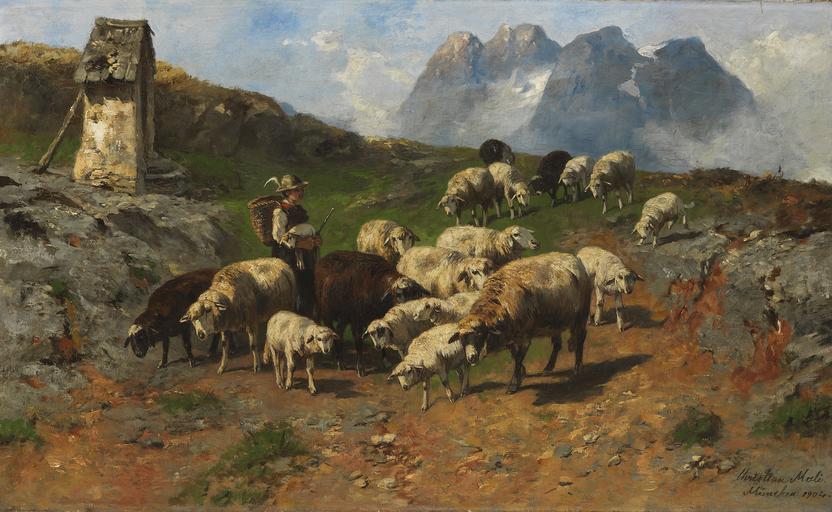 | Keywords: Christian Friedrich Mali - Hirtenjunge mit Schafen im Gebirge (1904).jpg Artwork Creator Christian Mali 1904 oil canvas cm 60 5 99 object history credit line Christian Mali / München 1904 ~ lower right signature and date accession number http //www kettererkunst de/kunst/kd/details php obnr 113003378 anummer 412 Ketterer Kunst 22 11 2013 Lot 184 PD-old-100 Christian Mali Paintings of sheep pastoral landscape paintings Landscape paintings of Germany 1900s landscape paintings 1904 paintings Images from Ketterer Kunst |