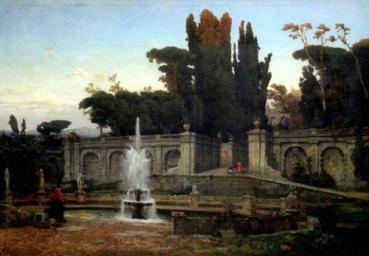 View Original: | Christian_Johannes_Wilberg_-_Monumentale_Brunnenanlage_im_Park_einer_italienischen_Villa,_deren_sonnenbeschienene_Bekrönung_durch_die_Bäume_sichtbar_ist.jpg (576x400) | |||