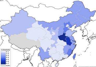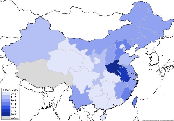 Keywords: Christianity in China 2010s.png Distribution of Christians in China in the 2010s by province according to CGSS 2009 and CFPS 2012 China General Social Survey 2009 results reported in https //baylor-ir tdl org/baylor-ir/bitstream/handle/2104/9326/WANG-THESIS-2015 pdf sequence 1 Xiuhua Wang 2015 p 15 ; Chinese Family Panel Studies 2012 for Shanghai Guangdong Henan Liaoning and Gansu report http //iwr cass cn/zjwh/201403/W020140303370398758556 pdf 当代中国宗教状况报告 基于CFPS 2012 调查数据 p 013 2015-09-14 Aethelwolf Emsworth Allowed to copy and distribute Religion maps of China Christianity in China |