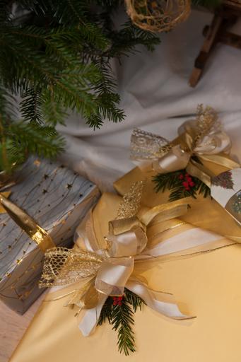 Keywords: christmas presents gift wrap ribbon gold silver bows christmas tree giving season decoration