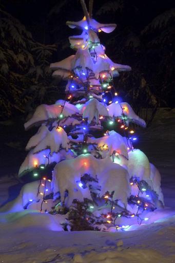 Keywords: christmas tree blue spruce natural snow covered winter season holiday illuminated colorful lighting bulbs night scene tradition festival glowing outside decoration night shot