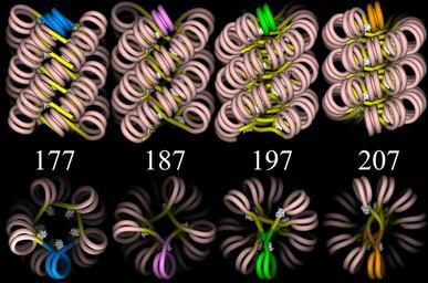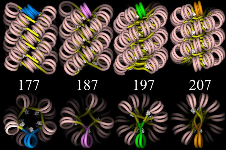 Keywords: ChromatinFibers.png Four proposed structures of the 30 nm chromatin filament for DNA repeat length per nucleosomes ranging from 177 to 207 bp Linker DNA in yellow and nucleosomal DNA in pink Own 10/06/2007 Julien Mozziconacci Chromosomes Molecular biology |