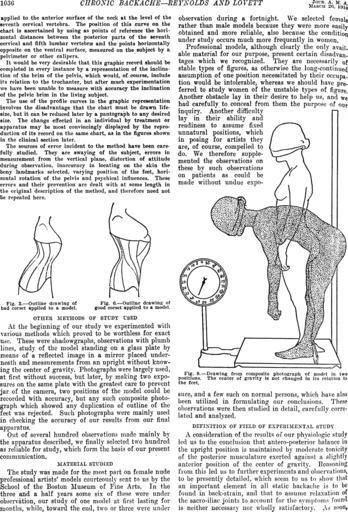 Keywords: ChronicBackache1036.png CHRONIC BACKACHE--REYNOLDS AND LOVETT Journal of the American Medical Association Chicago Ill 1910 REYNOLDS Edwards AND LOVETT Robert W PD Image ChronicBackache1035 png of the method and therefore need not be repeated here Fig 3 --Outline drawing or bad corset applied to a model Fig 6 --Outline drawing or good corset applied to a model <center>OTHER METHODS OF STUDY USED</center> At the beginning of our study we experimented with various methods which proved to he worthless for exact use These were shadowgraphs observations with plumb lines study of the model standing on a glass plate by means of a reflected image in a mirror placed underneath and measurements from an upright without knowing the center of gravity Photographs were largely noed at first without success but later by making two exposures on the same plate with the greatest care to prevent jar of the camera two positions of the model could be recorded with accuracy but any such composite photograph which showed any duplication of outline of the feet was rejected Such photographs were mainly use l in checking the accuracy of our results from our final apparatus Out of several hundred observations made mainly by the apparatus described we finally selected two hundred as reliable for study which form the basis of our present communication <center>MATERIAL STUDIED</center> The study was made for the most part on female nude professional artists' models courteously sent to us by the School of the Boston Museum of Fine Arts In the three and a half years some six of these were under observation our study of one model at first lasting for months while toward the end two or three were under observation during a fortnight We selected female rather than male models because they were more easily obtained and more reliable also because the condition under study occurs much more frequently in women Professional models although clearly the only available material for our purpose present certain disadvantages which we recognized They are necessarily of stable types of figures as otherwise the long-continued assumption of one position necessitated by their occupation would be intolerable whereas we should have preferred to study women of the unstable types of figure Another obstacle lay in their desire to help us and we had carefully to conceal from them the purpose of our inquiry Another difficulty lay in their ability and readiness to assume fixed unnatural positions which in posing for artists they are of course compelled to do We therefore supplemented the observations on these by such observations on patients as could be made without undue expo- Fig 8 --Drawing from composite photograph or model in two positions The center or gravity is not changed in its relation to the feet sure and a few such on normal persons which have also been utilized in formulating our conclusions These observations were then studied in detail carefully correlated and analyzed <CENTER>DEFINITION OF FIELD OF EXPERIMENTAL STUDY</CENTER> A consideration of the results of our physiologic study led us to the conclusion that antero-posterior balance in the upright positiou is maintained by moderate tonicity of the posterior musculature exerted against a slightly anterior position of the center of gravity Reasoning from this led us to further experiments and observations to be presently detailed which scelll to us to show that an important clement in all static backache is to be found in back-strain and that to assume relaxation of the sacro-iliac joints to account for the symptoms founel is neither necessary nor wholly satisfactory As soon Permanent corset treatment School of the Museum of Fine Arts Reynolds and Lovett - Chronic Backache |