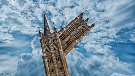 Keywords: church abstract steeple light religion sky clouds rays urban symbol remix architecture city building shape model industry parallel universe dimension inception zoom