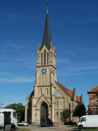 Keywords: church bruehl schutzengelkirche architecture building germany historic religion steeple tower spire front exterior facade worship spirituality christianity