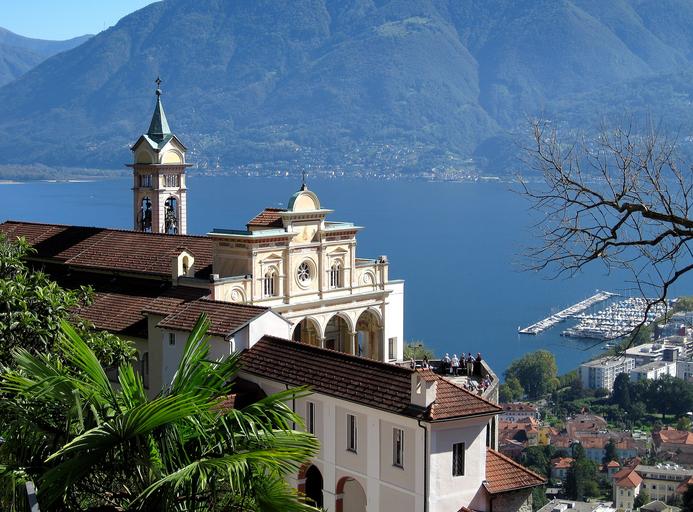 Keywords: church lake landscape pilgrimage church ticino locarno switzerland steeple mountains
