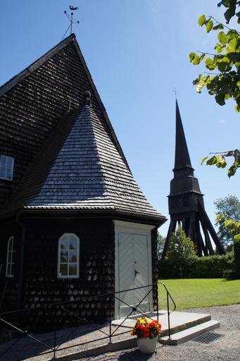 Keywords: church shingle wood shingles architecture religion wood christianity building spire facade steeple pelarne smaland sweden
