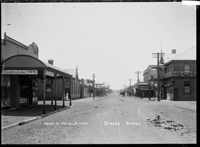 | Keywords: blackandwhite monochrome outdoor road photo border architecture locomotive vehicle train building black and white View looking down Church Street (now known as Elliot Street) with the Royal Hotel on the right; McCready & Love (tailors), Mechanics Institute; dentist, saddler, and other businesses on the left. The Masonic Hotel can be seen in the far distance on the left. Two women are standing at the entrance to the Mechanics Institute; a pram is on the footpath outside the dentist; a horse and cart are heading towards the photographer. Photograph taken by William A Price in early 1900s. Part of Strand Series of photographs. Inscriptions: Inscribed - Photographer's title on negative -bottom centre: Strand Seriesbottom left: Church St. Opotiki, NZ. 2239D. Quantity: 1 b&w original negative(s). Physical Description: Dry plate glass negative 4.5 x 6.5 inches Church Street, Opotiki. Price, William Archer, 1866-1948 :Collection of post card negatives. Ref: 1/2-001300-G. Alexander Turnbull Library, Wellington, New Zealand. natlib.govt.nz/records/23116962 View looking down Church Street (now known as Elliot Street) with the Royal Hotel on the right; McCready & Love (tailors), Mechanics Institute; dentist, saddler, and other businesses on the left. The Masonic Hotel can be seen in the far distance on the left. Two women are standing at the entrance to the Mechanics Institute; a pram is on the footpath outside the dentist; a horse and cart are heading towards the photographer. Photograph taken by William A Price in early 1900s. Part of Strand Series of photographs. Inscriptions: Inscribed - Photographer's title on negative -bottom centre: Strand Seriesbottom left: Church St. Opotiki, NZ. 2239D. Quantity: 1 b&w original negative(s). Physical Description: Dry plate glass negative 4.5 x 6.5 inches Church Street, Opotiki. Price, William Archer, 1866-1948 :Collection of post card negatives. Ref: 1/2-001300-G. Alexander Turnbull Library, Wellington, New Zealand. natlib.govt.nz/records/23116962 |