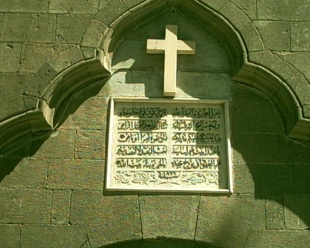 Keywords: Church-Syria.JPG واجهة لرواق كنيسة في مدينة دمشق القديمة مبنية في القرن التاسع عشر مكتوب فيها أبيات شعر باللغة العربية Church in the old city of Damascus with Arabic writing back to 1899 Made by Aziz1005 1899 2002-01-01 according to EXIF data Aziz1005 Churches in Damascus Arabic texts |