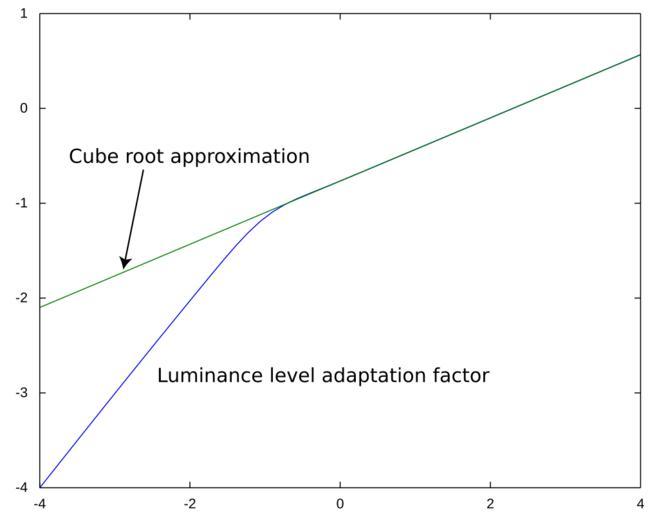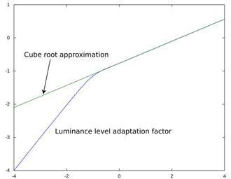 Keywords: Ciecam02 luminance level adaptation factor.svg CIECAM02 log-log plot of luminance level adaptation factor and its cube root approximation versus the luminance level of the adapting field The axes indicate the base 10 logarithm of the quantity so L<sub>A</sub> ranges from 10<sup>-4</sup> to 10<sup>4</sup> while F<sub>L</sub> ranges from 10<sup>-4</sup> to 10 MATLAB 2008-02-12 Myself MATLAB Code <pre> la logspace -4 4 k 1 / 5 la+1 fl k 4 la+0 1 1-k 4 2 5 la 1/3 loglog la fl la 0 1715 la 1/3 set gca 'XTickLabel' -4 2 4 'YTickLabel' -4 1 </pre> If you are curious as to how I derived the 0 1715 coefficient you need simply substitute la 1 to get k 1/6 and fl 0 1715 CIECAM02 |